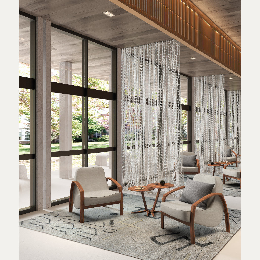 Venus kankaassa on isoa verkkokuviota. Tämä paloturvallinen kangas käy myös julkitilakäyttöön.
