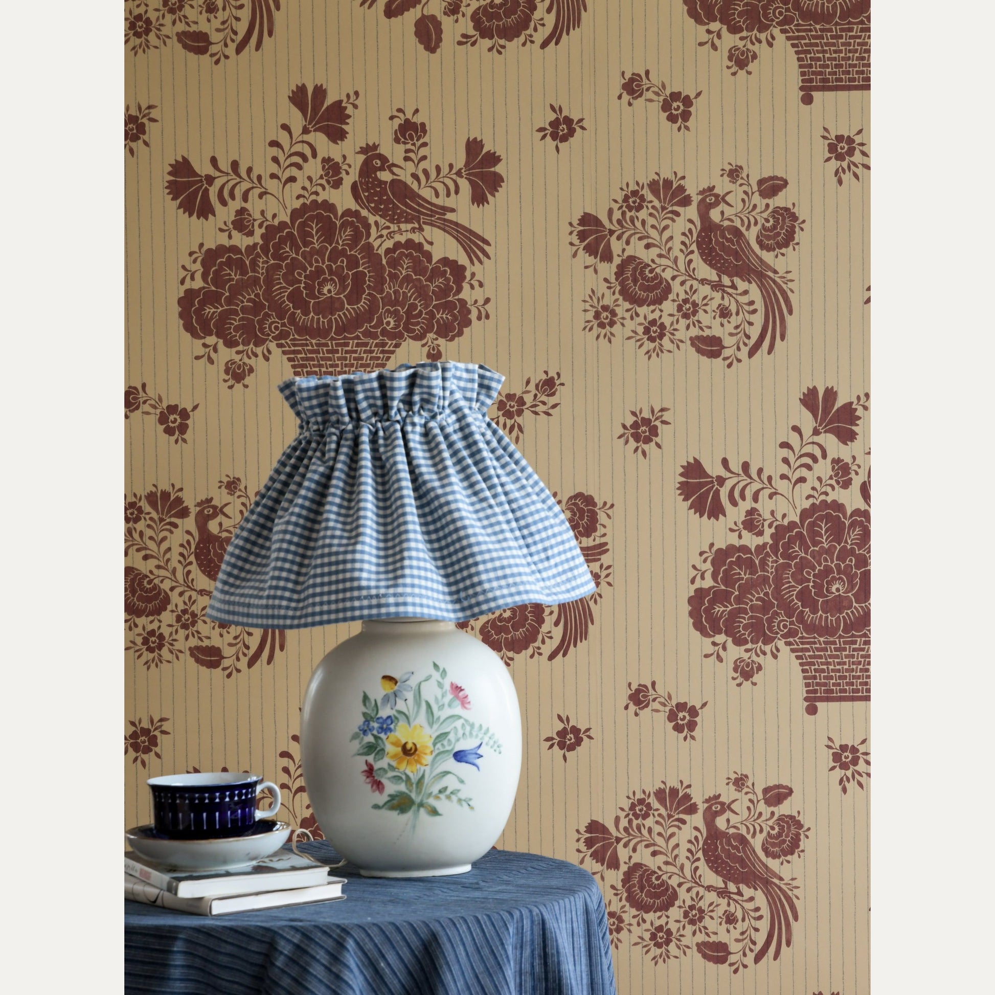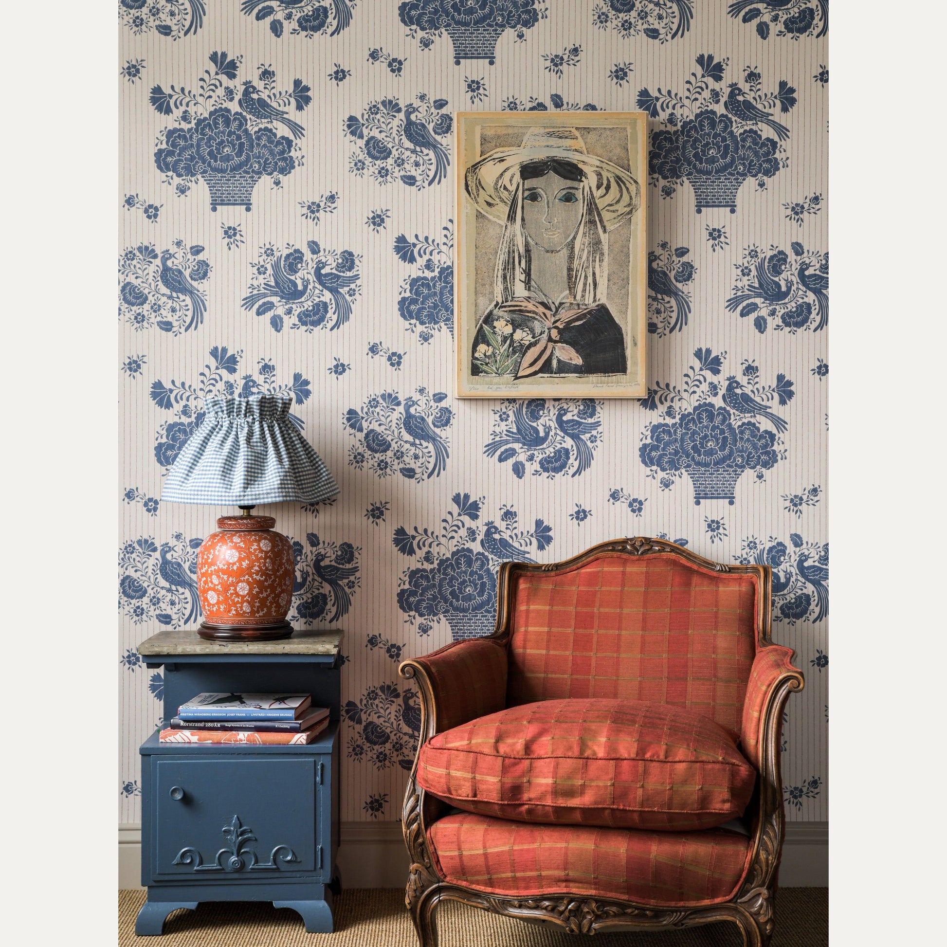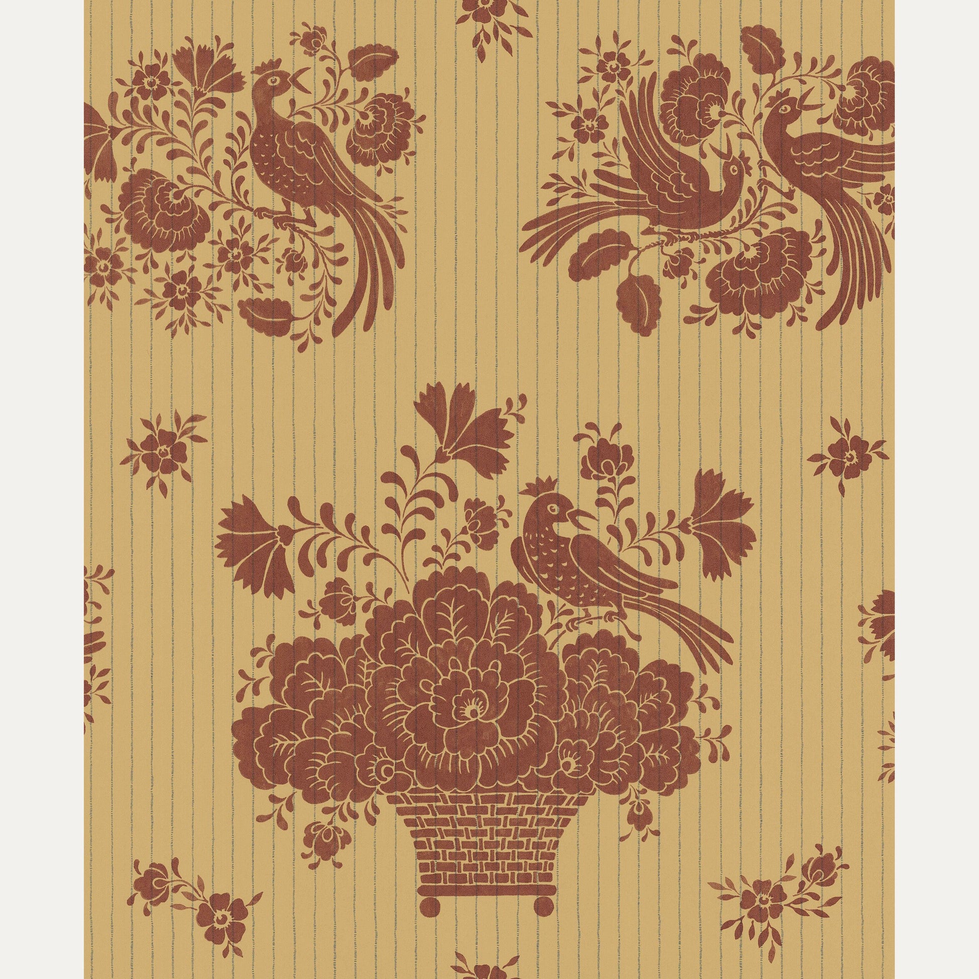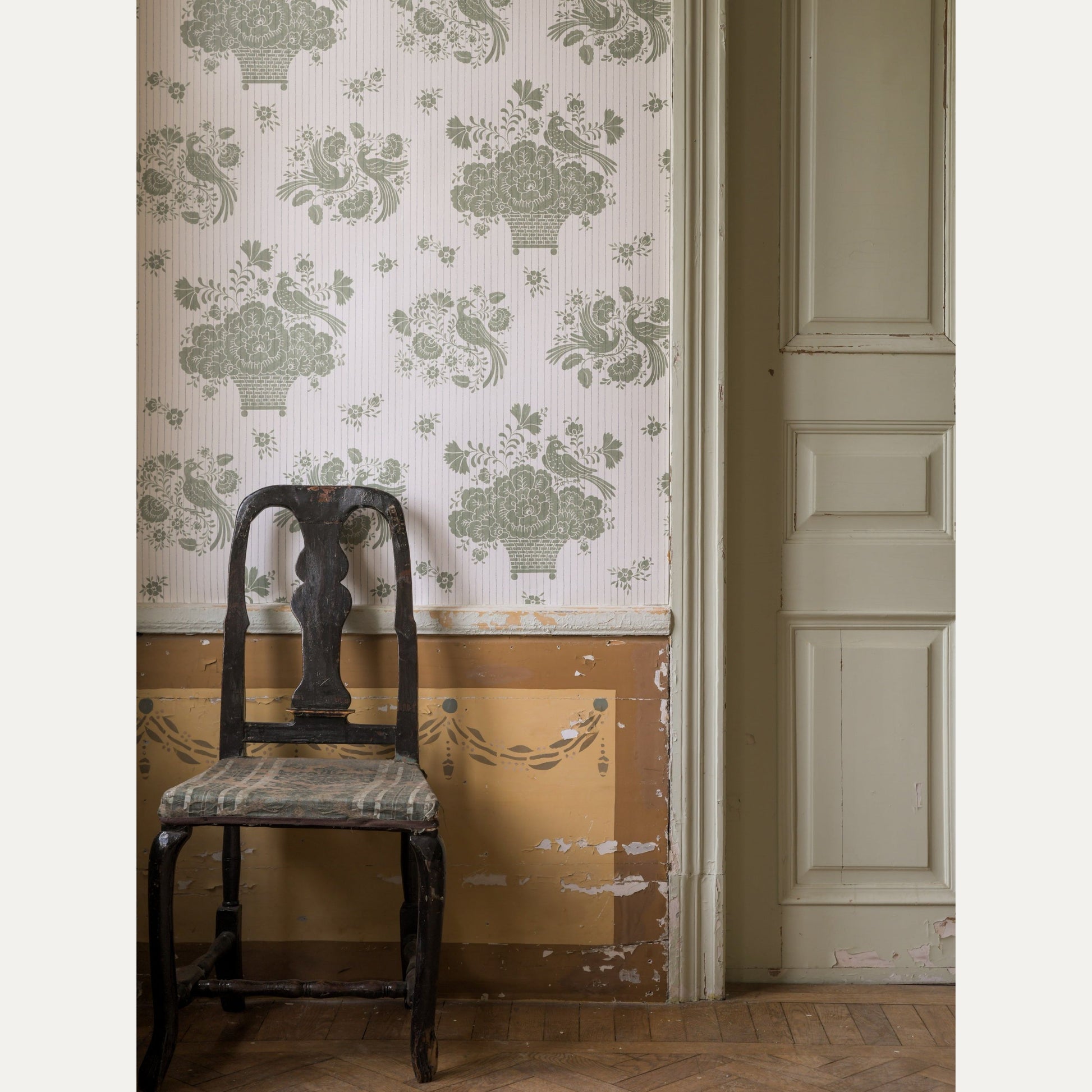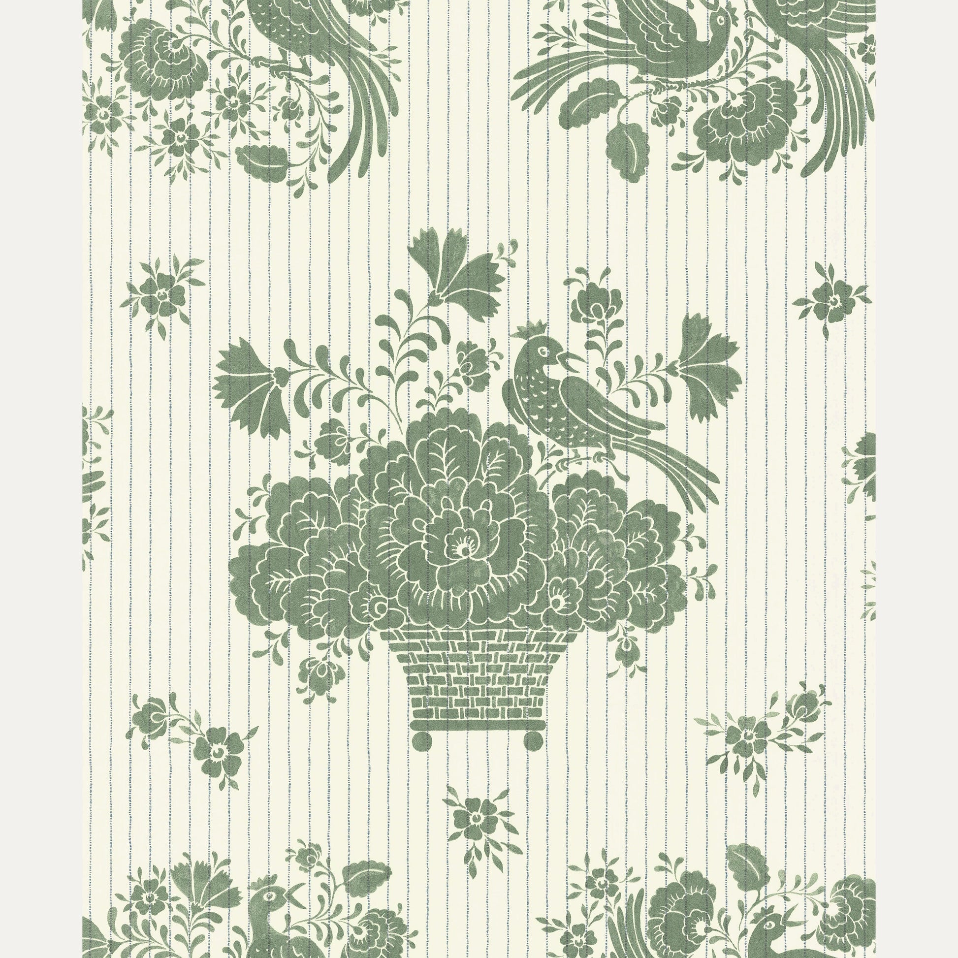 Ruotsalaisen Långelid / Von Brömssenin Birds Nest tapetti on saanut inspiraationsa ruotsalaisesta "kurbits" maalaustyylistä, jossa on koristeellisia lehtiä ja kukkasia. Varsinkin Taalainmaalla suosittu tyyli on yhdistetty hauskasti liituraita taustaan.