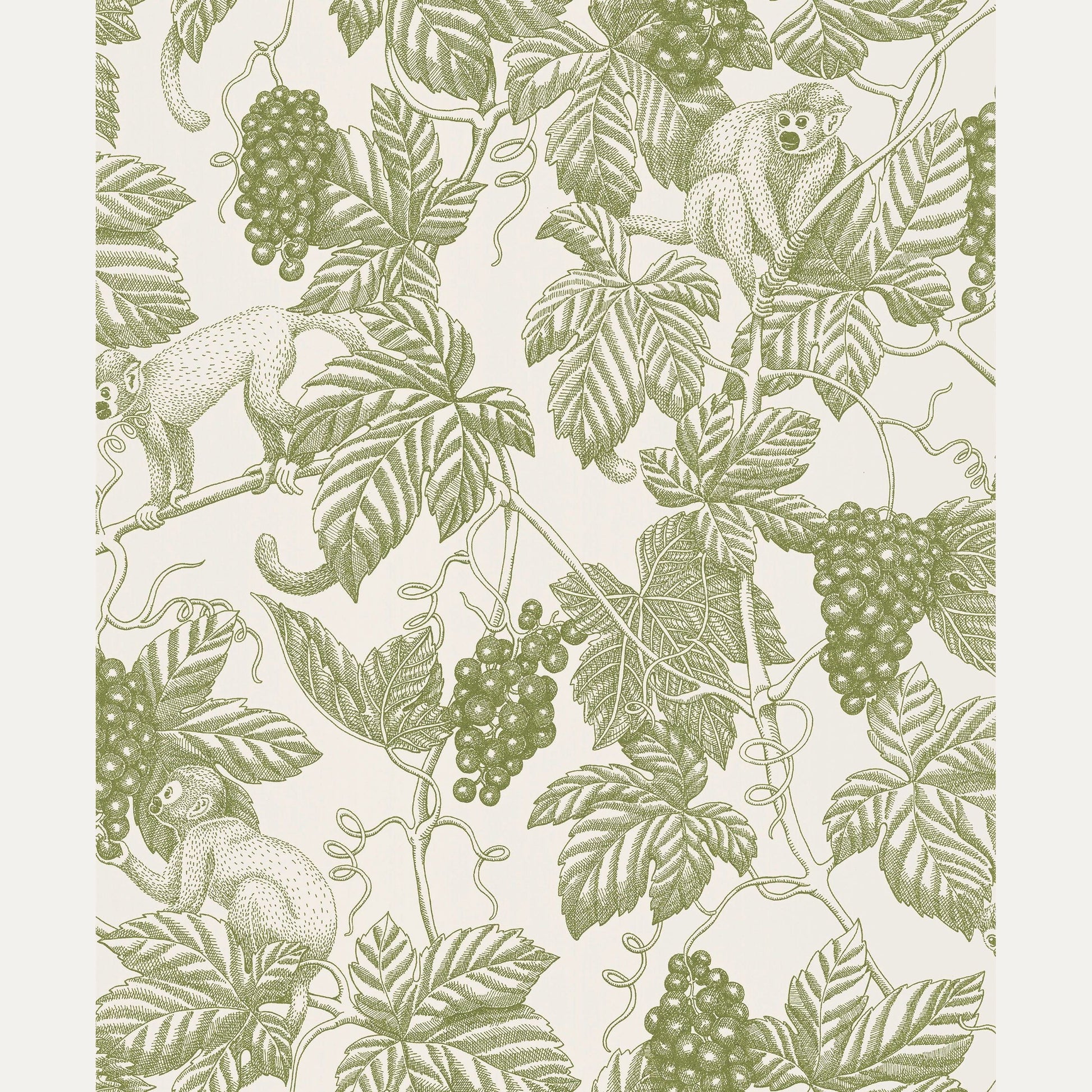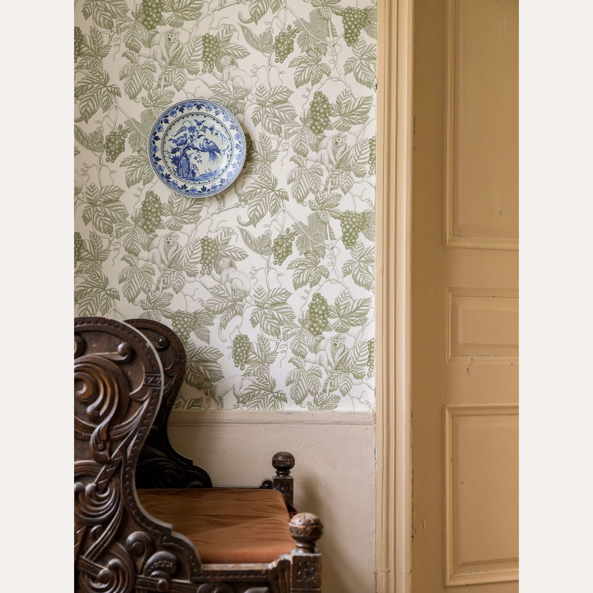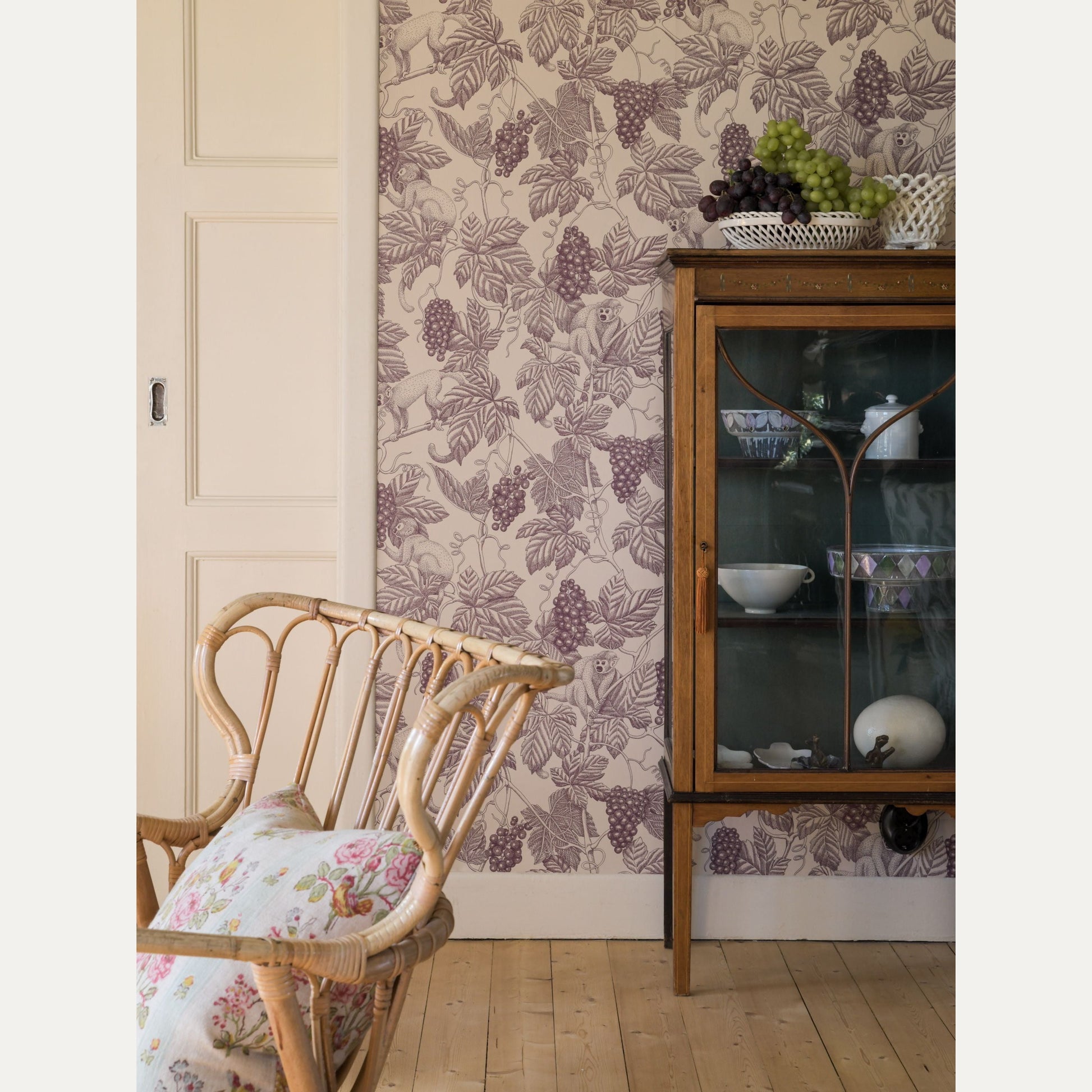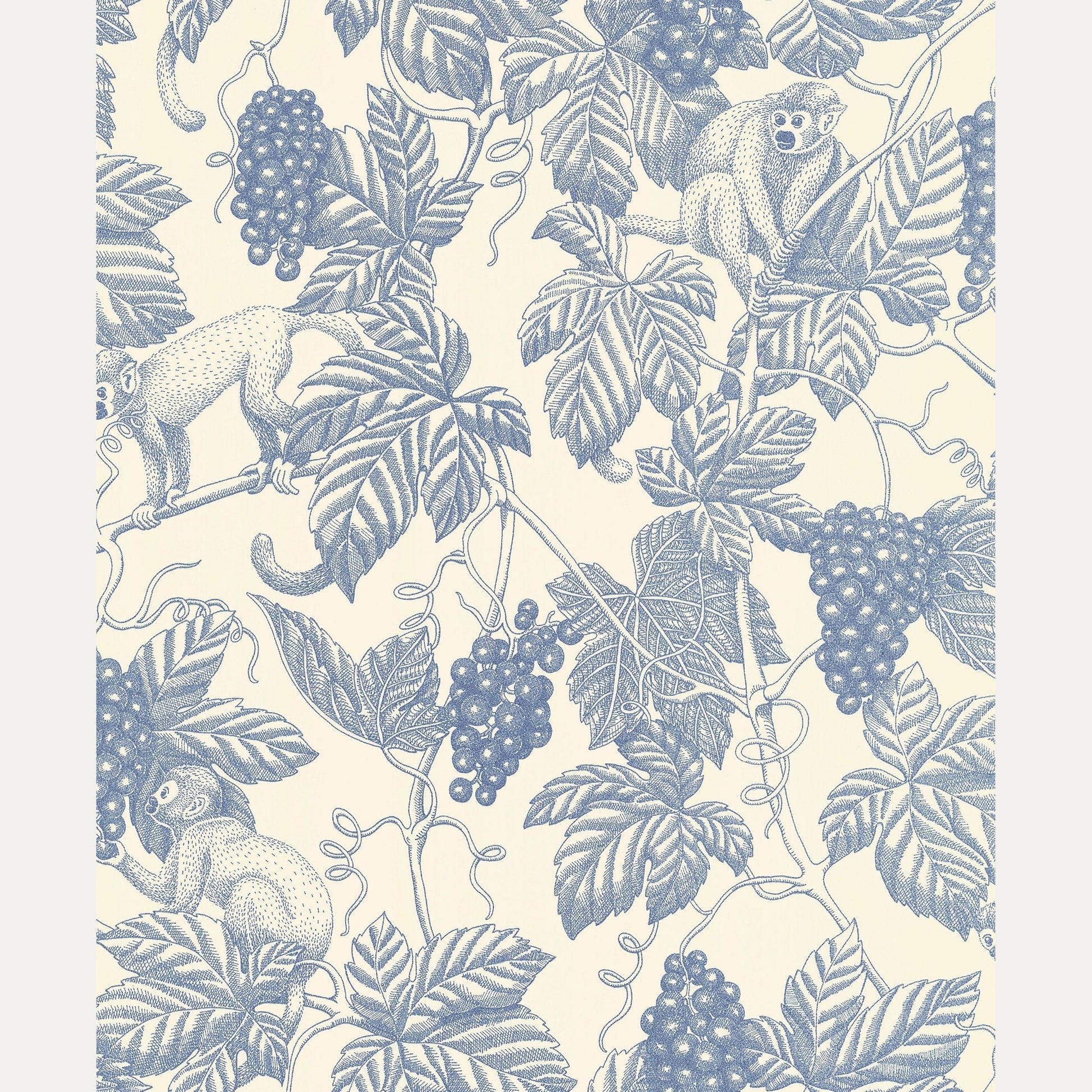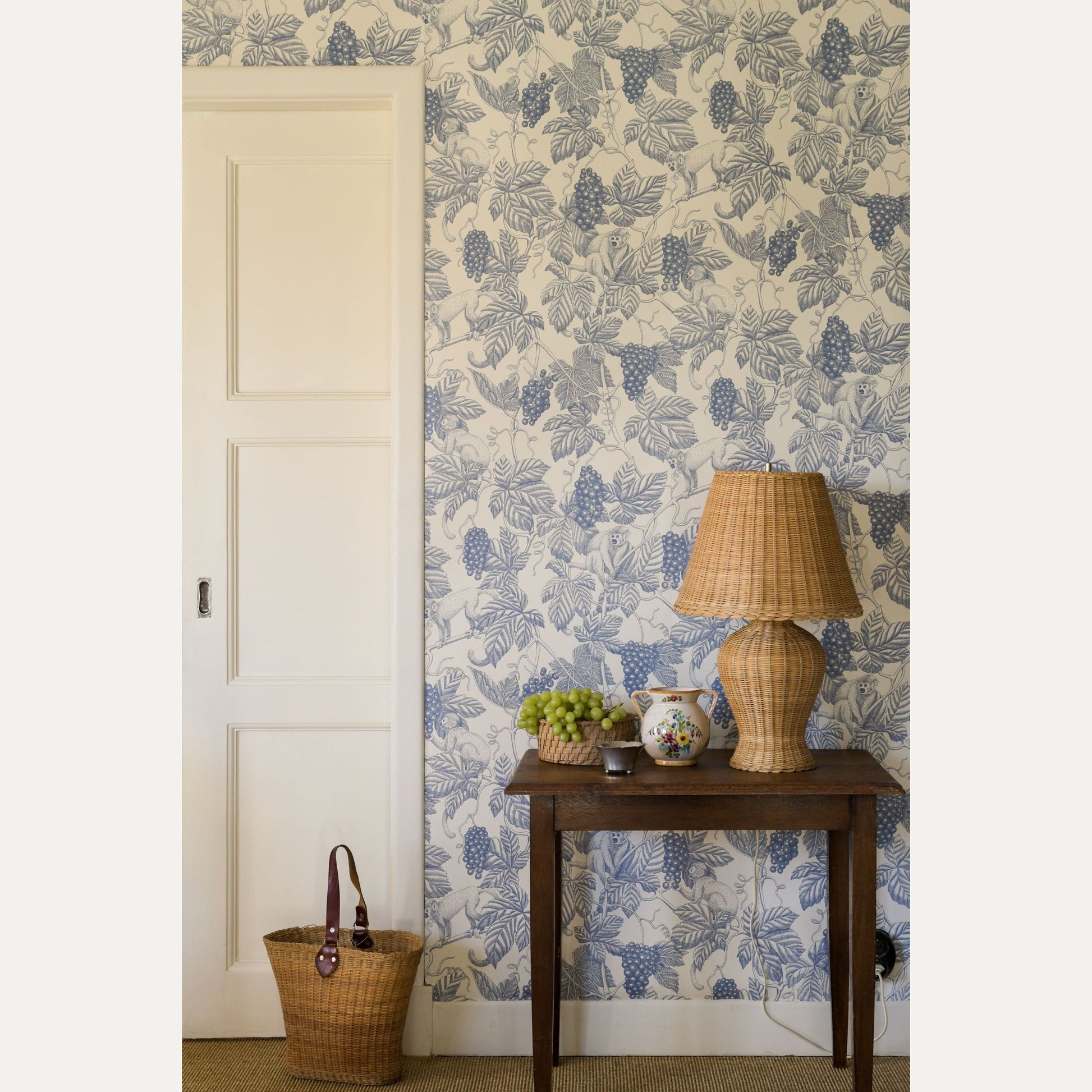 Ruotsalaisen Långelid / Von Brömssenin Grape Thief on leikkisä tapetti, jossa viekas apina kahmii rypäleitä pitkin puita. Toile de Jouy-tyyliin valmistettu tapetti antaa luonnetta sisustukseen.