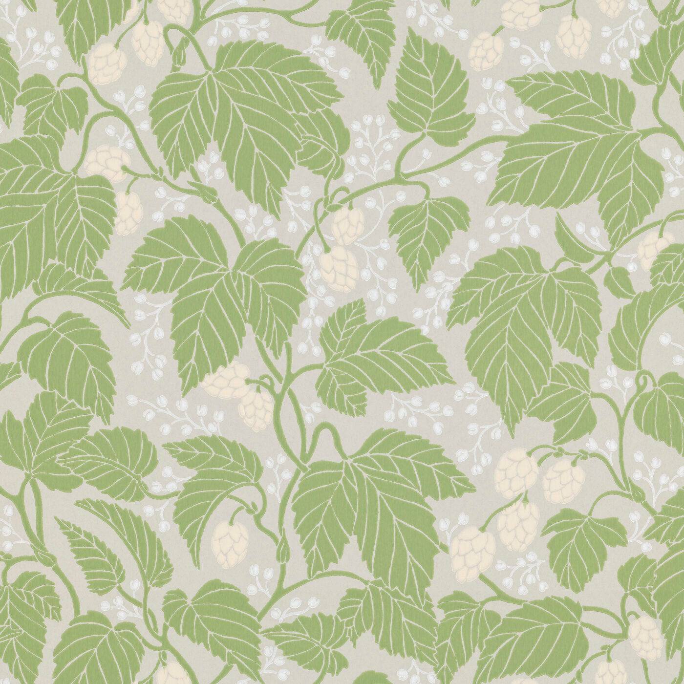 Långelid / Von Brömssenin Hops and glory-tapetissa on kiemurtelevia lehtiruoteja ja kukkasia, jotka ovat kietoutuneet toisiinsa.