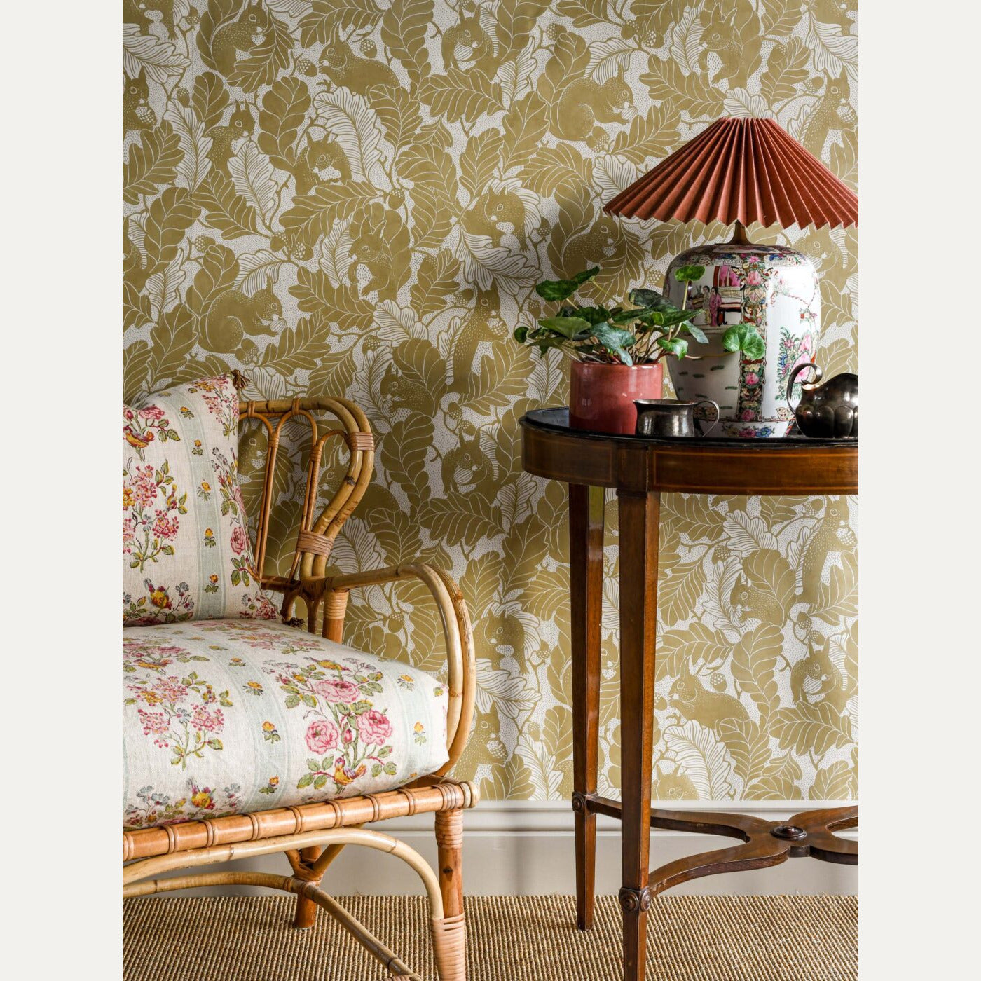 Långelid / Von Brömssenin Oak tree tails on hurmaava tapetti, jossa leikkisät oravat seikkailevat ja tutkivat tammenterhoja.