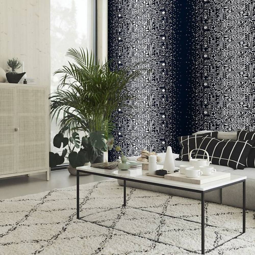 Yön varjo-tapetti vie katsojan valosta varjoon, aamusta yöhön. Sanna Annukan suunnittelemasta kuosista on löydettävissä kansanperinteiden innoittamia symboleita, muun muassa metsiemme kuninkaan karhun.